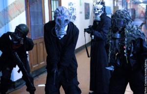 Scripted by Zach Chassler (who also penned Kasten’s THE WIZARD OF GORE remake) and shot in the filmmaker’s hometown of Baltimore, THE DEAD ONES “is about four high-school students who are given detention to clean a school after hours that looks like a tornado hit it,” he tells us. “It’s been torn apart, it’s filthy and disgusting. While they’re there, they start to unravel the mystery of the school’s past, and what they figure out is that a horrible event took place at the school, and their connection to this massacre is intrinsic to the plot and their own backgrounds.” The villains seen below are known as the Gasmasks, representing (left to right) War, Famine, Death and Pestilence.